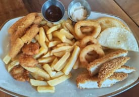 Plancha con Papas Fritas, Brochetas de Pollo y filete de vacuno, aros de cebolla, acompañado de salsas