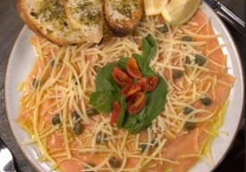 Láminas de salmón ahumado, queso parmesano, alcaparras, aderezado con aceite de oliva y jugo de limón.