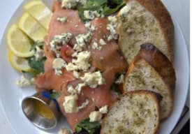 Lechugas escarola e, hidropónica, rúcula, queso azul, salmón ahumado, tomate Cherry y crutones espinaca