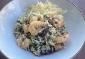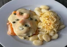 Salmón a la plancha con salsa de camarones y alcaparras, gnocchi, mantequilla, salvia y queso parmesano