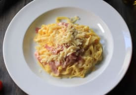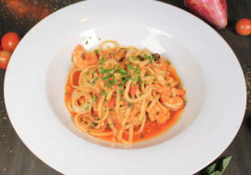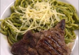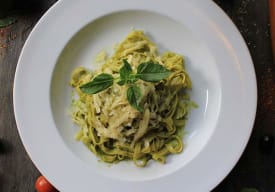 Pasta fetuccini al huevo, pesto de albahaca, toque de crema de leche y queso parmesano.