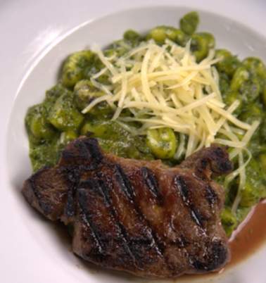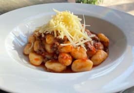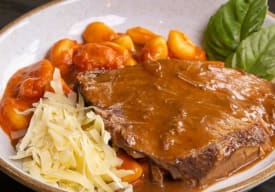 Carne de vacuno plateada al jugo acompañada de gnocchi con salsa pomodoro un toque de crema y queso parmesano
