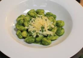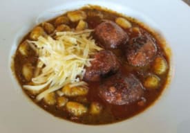 Pasta gnocchi, salsa a base de Pomodoro, miel y un toque de pesto, albóndigas a la Pomodoro y toques de parmesano.