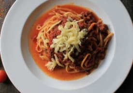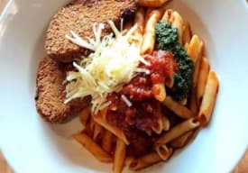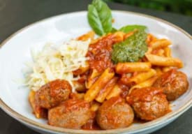 Pasta Penne, salsa Pomodoro, albóndigas, toque de pesto albahaca y queso parmesano.