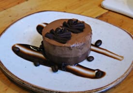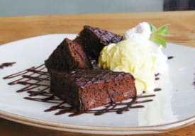 Exquisito brownie bañado con salsa de chocolate , acompañado con helado de vainilla bourbon, crema chantilly y canela.