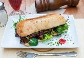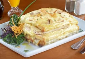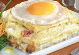 Clásico francés, en pan brioche acompañado de queso gauda, jamón acaramelado, bañado con salsa bechamel y gratinado con queso mozzarella.