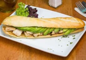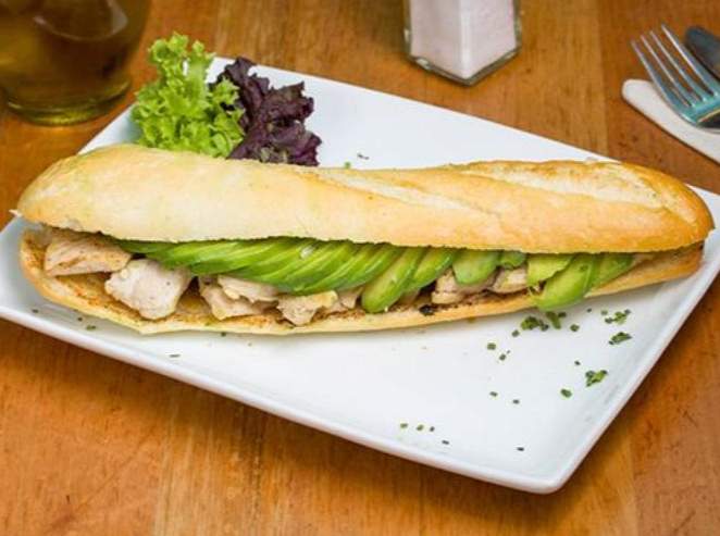Sándwich de pollo a la plancha, palta laminado y hoja de lechuga fresca.