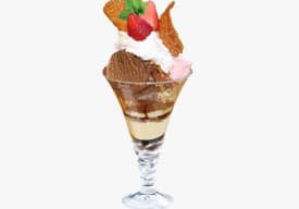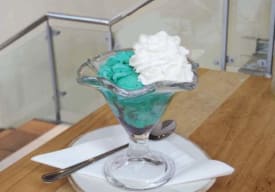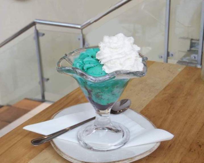 Copa de tres sabores de helados a elección con un bizcocho ,salsa de frutos rojos ,nueces y salsa de caramelo.