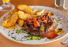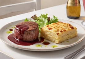 Corte de Lomo liso de 220 grs bañado de una salsa bourguiñon con papas trufadas y parmesano