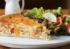 Tradicional tarta salada de vegetales gratinada, acompañada de ensalada verde.