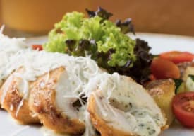 Cordon Bleu Clásica pechuga de pollo rellena de jamón y queso apanado con panko, acompañada de vegetales salteados y salsa bechamel.