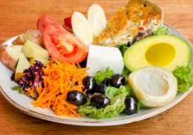 Mix de lechuga, papas cocidas, quesillo, choclo, aceituna negra, zanahoria, fondo de alcachofa, tomate, palta, pepino y un trozo de quiche de vegetales.