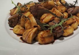 Gnocchi de papa con trozos de filete de vacuno, mix de champiñones y cebollín