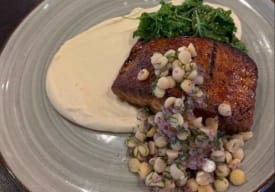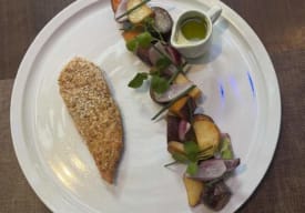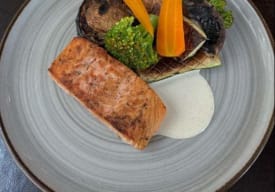 Pescado del día acompañado de vegetales de temporada a la parrilla y mayonesa tibia.