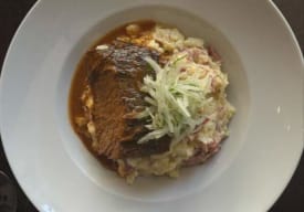 Guiso de ternera, champiñones y cebollita perla acompañado de arroz anizado.