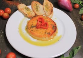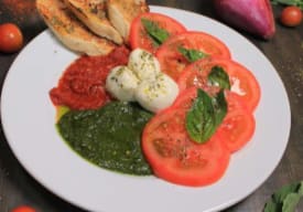 Bocaditos de mozzarella Fior de Latte, albahaca, láminas de tomate, pesto, salsa Pomodoro, aceite de oliva y orégano.