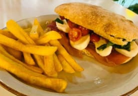 Mortadella, Acompañado De Queso Ricotta, Lechuga, Rúcula, Berenjena Y Papas Fritas