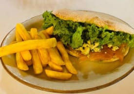 Salmón Ahumado, Acompañado De Lechuga, Rúcula, Queso Azul Y Papas Fritas