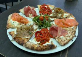 Masa de pizza, base de queso crema cibulette, salmón ahumado, Peperonata (contiene ajo y vinagre), Berenjenas(contiene cacho de cabra, vinagre), Prosciutto.