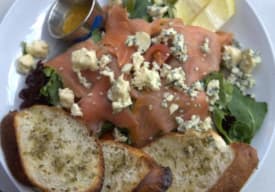 Lechuga escarola y hidropónica, rúcula, queso azul, salmón ahumado, tomate cherry y espinaca