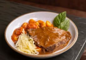 Plateada de vacuno acompañada de gnocchi con salsa Pomodoro y queso parmesano.