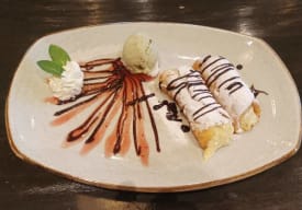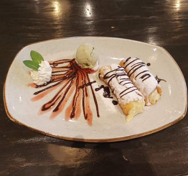 Postre tradicional SICILIANO, Masa dulce rellena con pastelera al limón y ricotta, acompañada con helado de pistacho