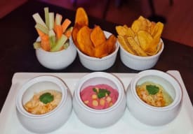 Hummus de garbanzos al pesto, de Betarraga y tradicional con crudités vegetales (zanahoria, apio, pepino) y chips de plátano y papas.
