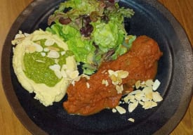 Albóndigas de carne de soja, acompañado de hummus de garbanzo, pesto de hierbas, almendras y ensalada verde aderezada con limoneta