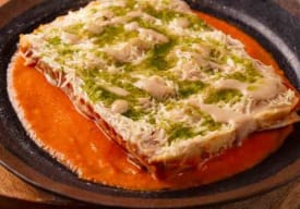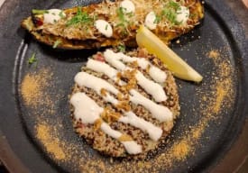 Masa de lasaña, champiñones, salsa blanca, pomodoro, queso vegano y pesto de hierbas.