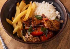 Seitán salteado con cebolla morada, tomate y cebollin acompañado de arroz blanco y papas fritas.