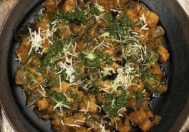 Gnoquis en salsa de tomate con berenjenas, aceitunas negras, alcaparras fritas, queso vegano rallado, pesto de hierbas y perejil.