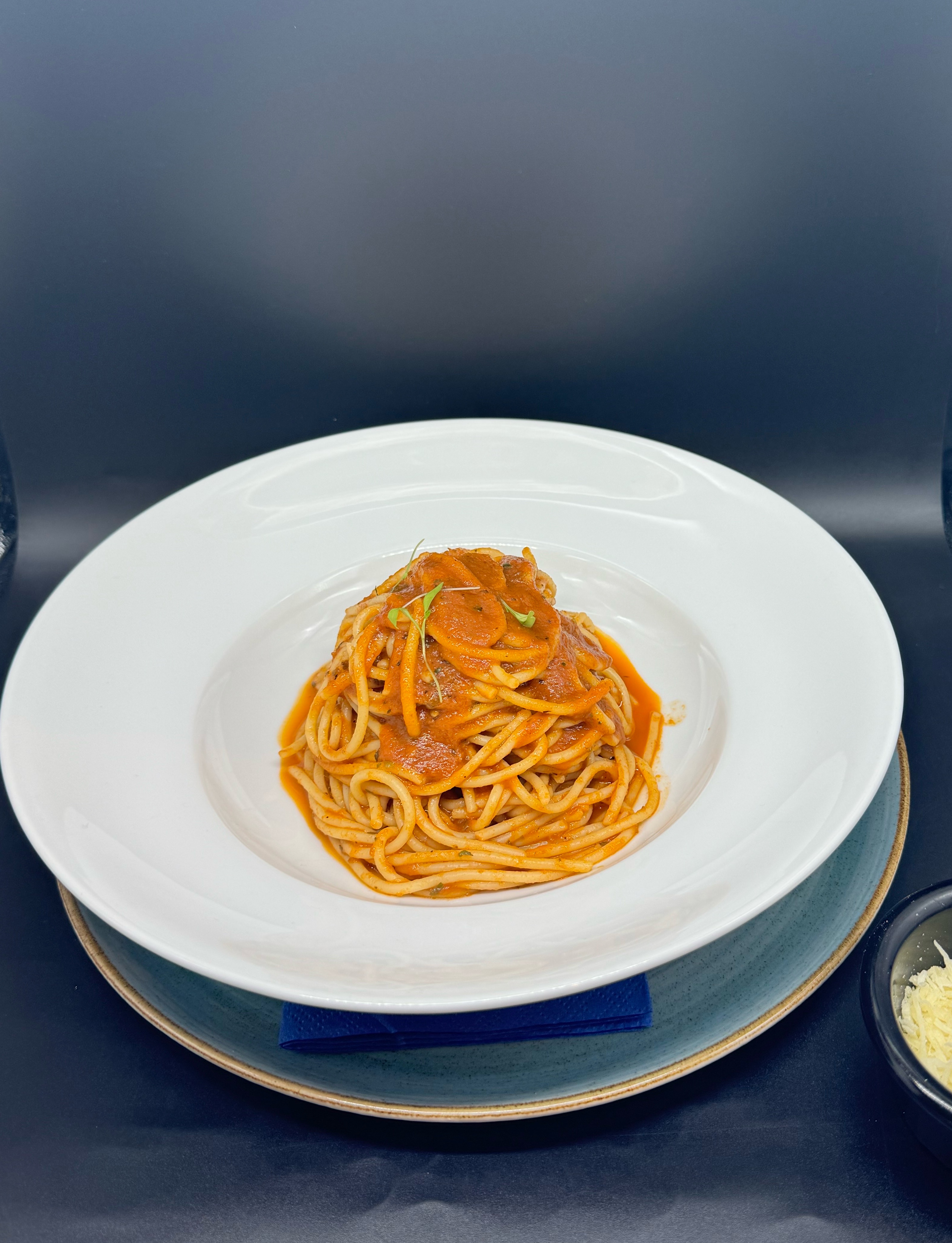 Deliciosa pasta con salsa alfredo o pomodoro según elección con toque de queso parmesano