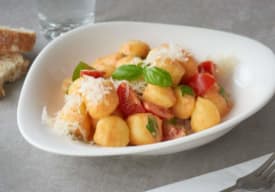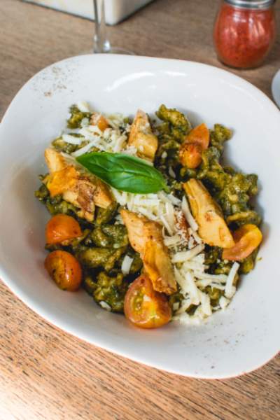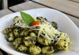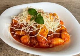 Nuestros gnocchi de papa en una salsa pomodoro hecha en casa con un toque de nuestro delicioso pesto basílico.