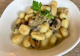 Gnocchi de papas salteados con champiñones (ostra y paris) y un toque de vino blanco y crema de leche, terminado con parmesano y un toque de perejil.