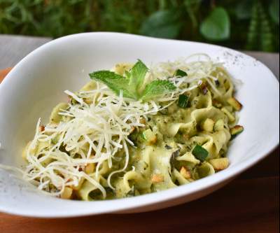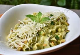 Pesto de zapallo italiano, aceite de oliva, maní y albahaca, con nuestra pasta fresca.