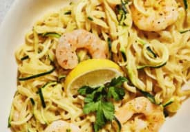 | Pappardelle es la pasta que viene en este delicioso pesto de pimentón amarillo acompañado de camarones, zoodles y limón. Pruébalo también con extra salmón. |