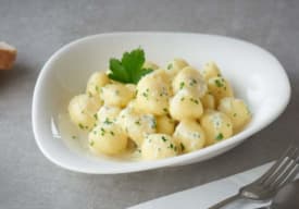 Nuestros gnocchi de papa clásicos acompañados de nuestra salsa 3 quesos (gorgonzola, parmesano y mozzarella) y un toque de cebollín.
