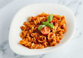 Con campanelle. Una increíble mezcla de carne molida, cebolla, apio y zanahoria con nuestra salsa de tomates hecha en casas y un ligero toque de albahaca.