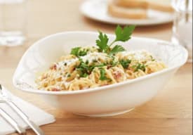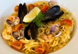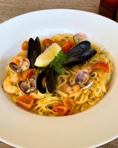 | Pasta acompañada de camarones, choritos y almejas baby, en una cremosa salsa con un toque de limón. |