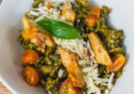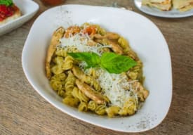 Pollo a la plancha acompañado de tomates cherry, crema de leche, un toque de pesto basílico y parmesano.