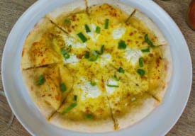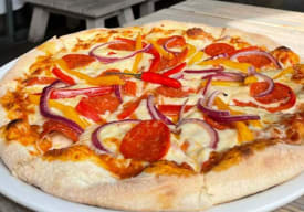 Masa casera, salsa BBQ, queso ahumado con pollo BBQ, cebolla morada y nuestra mezcla de bruschetta.