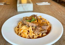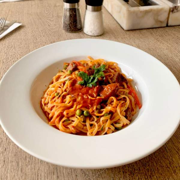 Delicioso y tradicional guiso de carne de cocción lenta acompañado con nuestra pasta hecha en casa