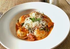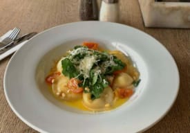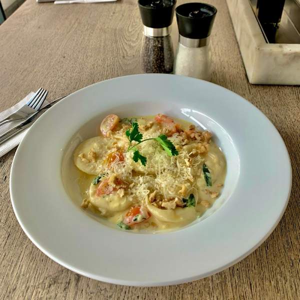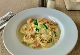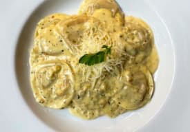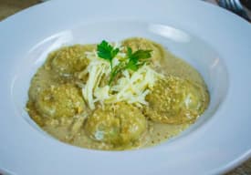 Deliciosa pasta rellena de espinaca, ricota y nueces en una emlusión de fondo verduras, mantequilla y crema. Pruébalos también con pollo o camarones