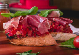 | Exquisita mezcla de tomates, albahaca, orégano, ajo, aceite de oliva y prosciutto di Parma. |