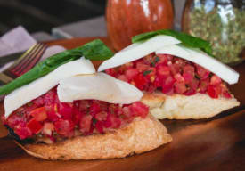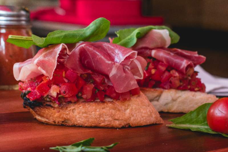 Mezcla de tomate fresco, ajo, albahaca, rúcula y aceite de oliva sobre crujiente pan ciabatta.