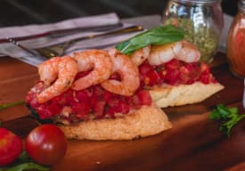 | Exquisita mezcla de tomates, albahaca, orégano, ajo, aceite de oliva, pero esta vez con camarones salteados. |