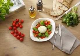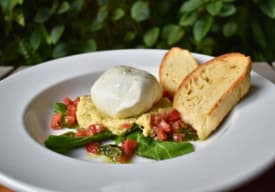 | Exquisita mezcla de tomates, albahaca, orégano, ajo, aceite de oliva con fresca mozzarella fior di latte. |