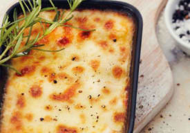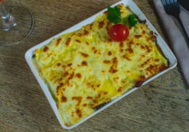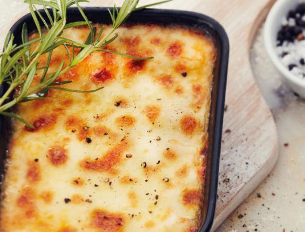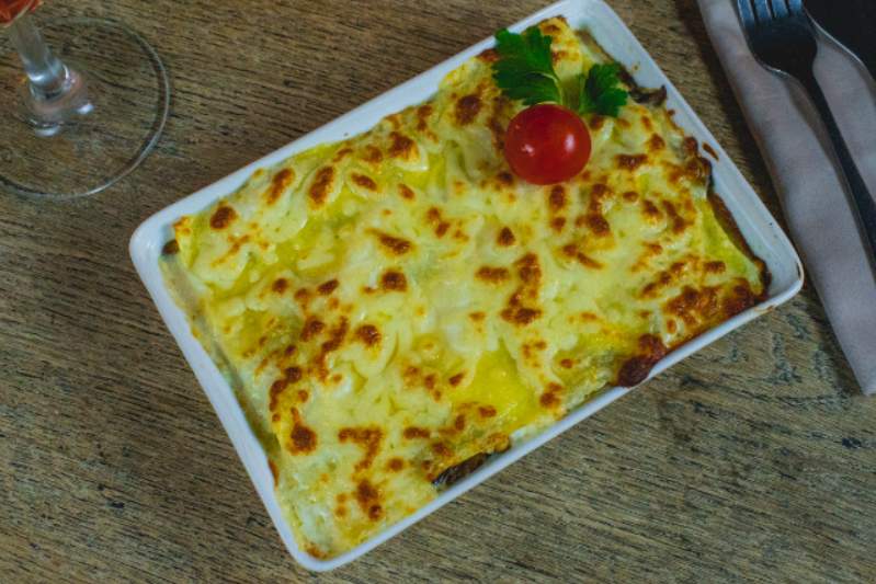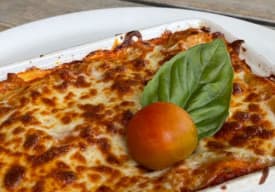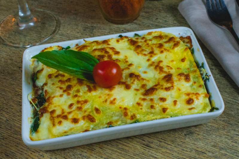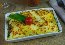 Carne de res, albahaca, salsa bechamel, parmesano, todo terminado con mozzarella.