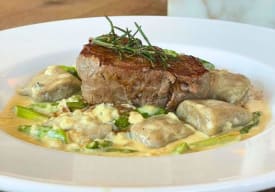 Filete a la plancha sobre cremoso gnocchi casero de patata acompañado de espárragos salteados, cebolla blanca y un toque de queso azul...Imperdible!